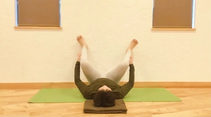 ①壁にお尻をつけて仰向けになります。