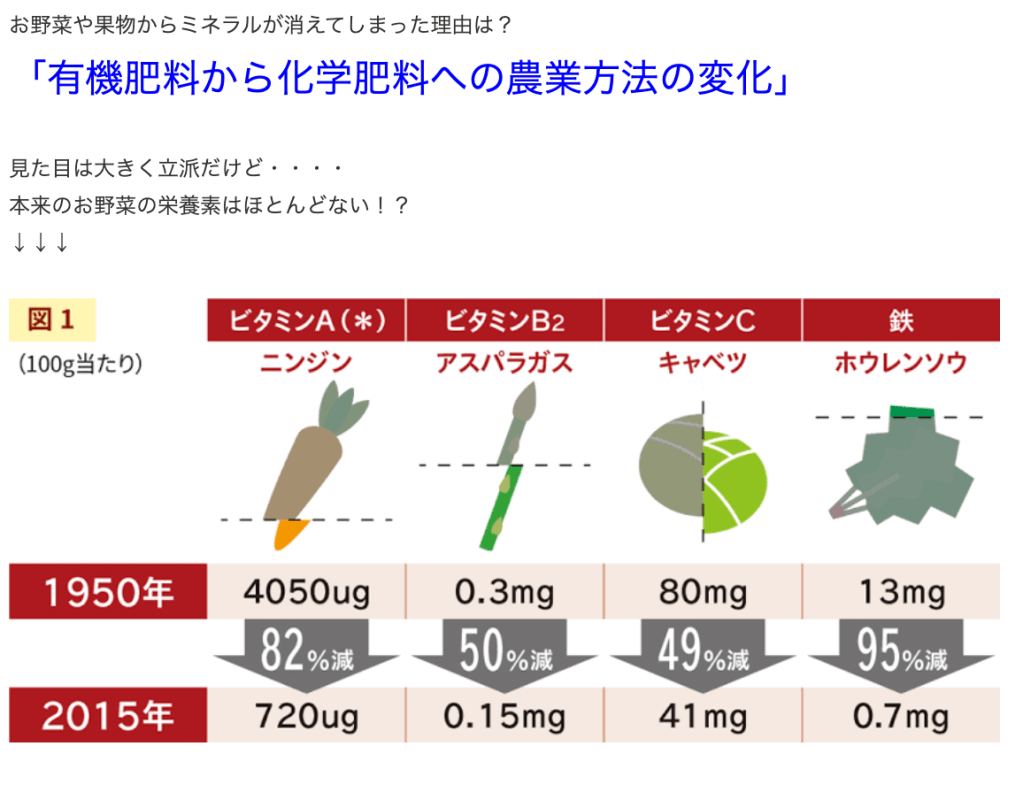 1914年以降のキャベツ・レタス・トマト・ほうれん草のカルシウム・マグネシウム・鉄分の80〜90%が減少。